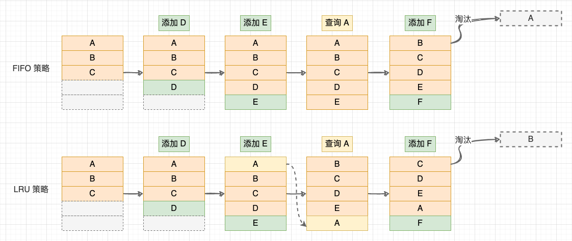 - 操作 4 - 淘汰数据: 添加数据时如果容量已满,则根据缓存淘汰策略一个数据。