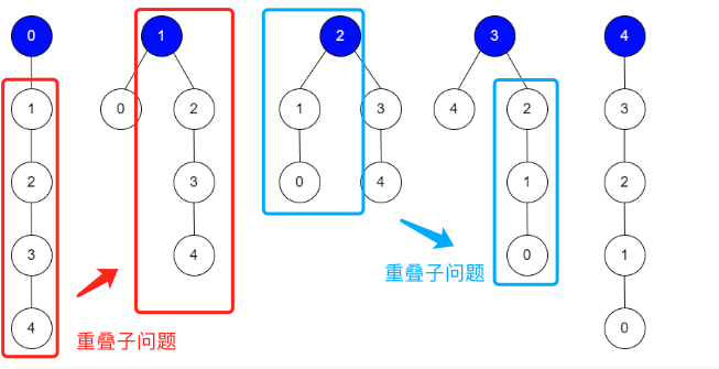 我们发现: 每次调整中只有条边的结构关系变化。比如从根 0 调整到根 1 时,只有 0 → 1 被修改为 1 → 0,而其他边都没有变化,存在重叠子结构 / 重叠子问题。