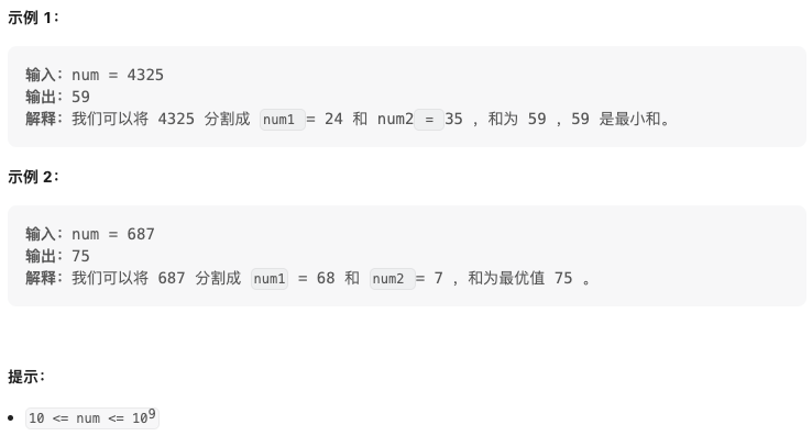 给你一个正整数 num ,请你将它分割成两个非负整数 num1 和 num2 ,满足: