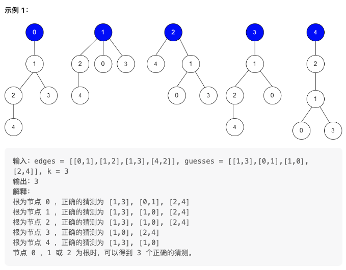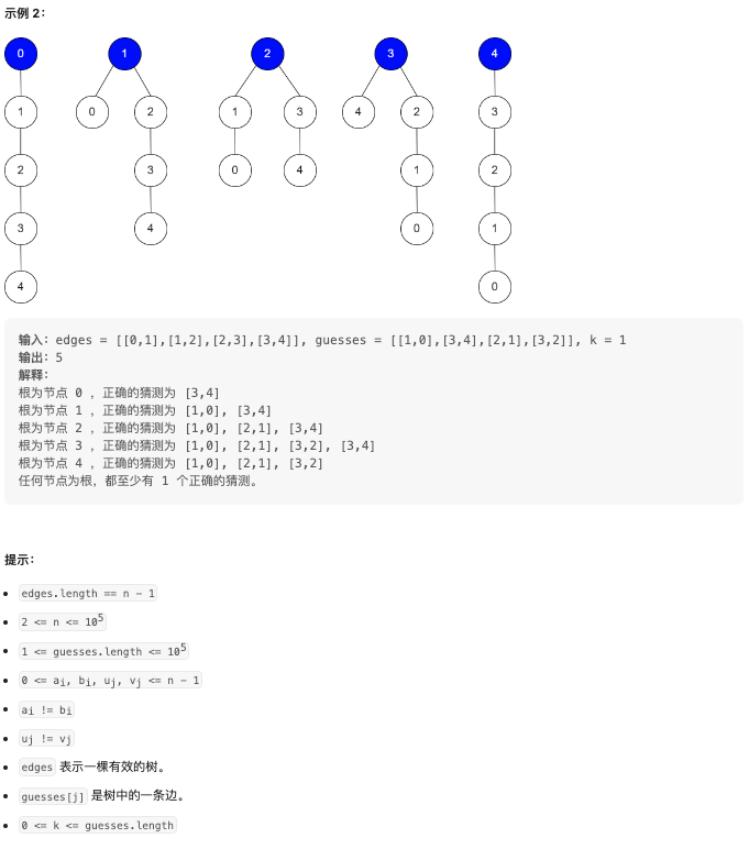 给你二维整数数组 edges ,Bob 的所有猜测和整数 k ,请你返回可能成为树根的 节点数目 。如果没有这样的树,则返回 0。