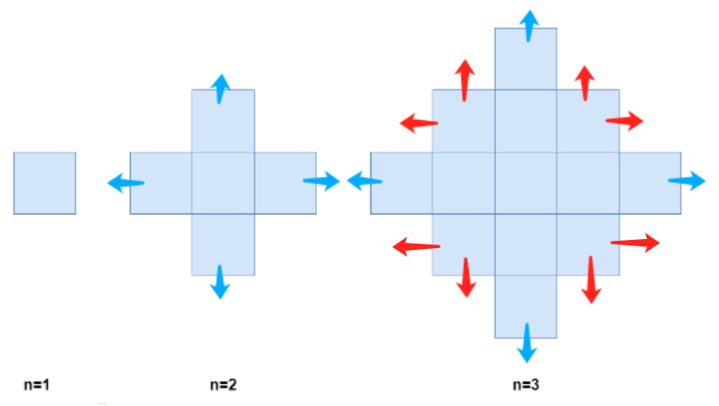 有一个无穷大的二维网格图,一开始所有格子都未染色。给你一个正整数 n ,表示你需要执行以下步骤 n 分钟: