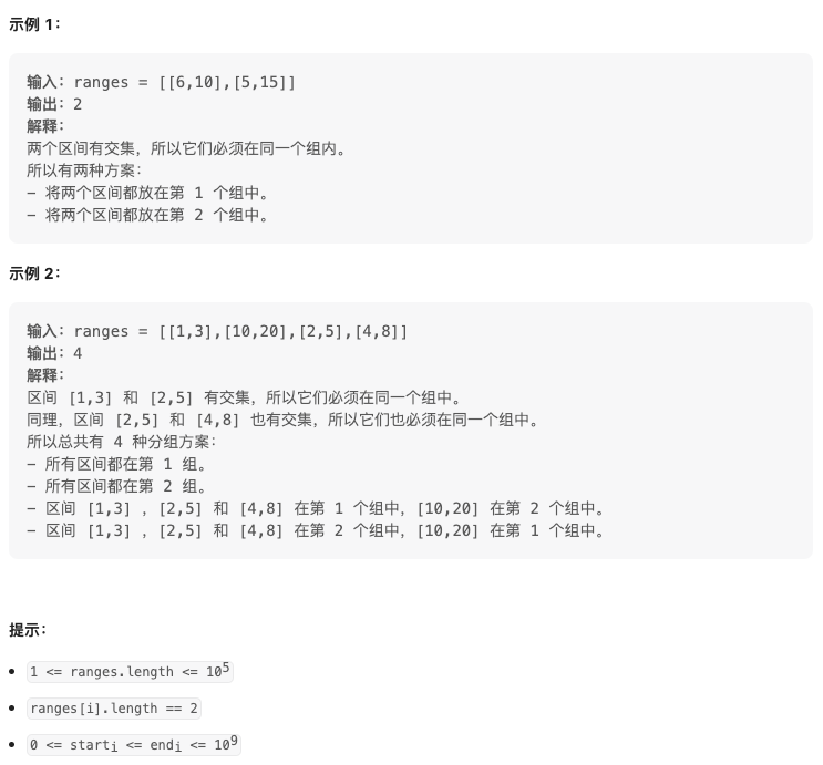 https://leetcode.cn/problems/count-ways-to-group-overlapping-ranges/