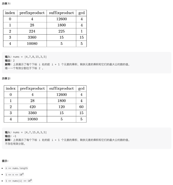 nums = [2, 3, 3],那么在下标i = 0处的分割有效,因为2和9互质,而在下标i = 1处的分割无效,因为6和3不互质。在下标i = 2处的分割也无效,因为i == n - 1。