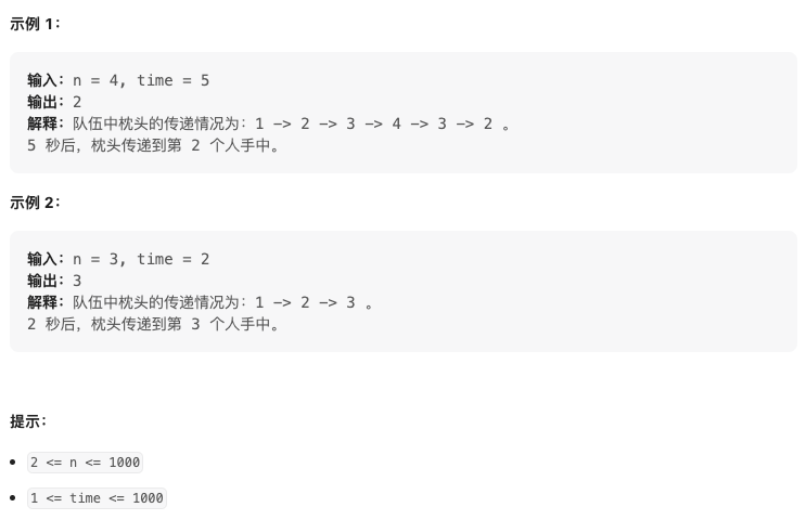 最初,排在队首的第一个人拿着一个枕头。每秒钟,拿着枕头的人会将枕头传递给队伍中的下一个人。一旦枕头到达队首或队尾,传递方向就会改变,队伍会继续沿相反方向传递枕头。
