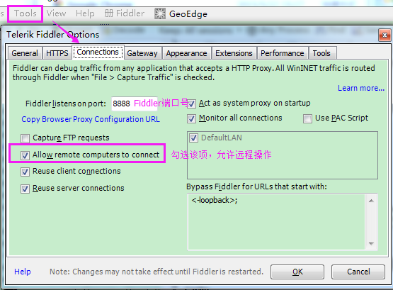 设置: Tools——>TelerikFiddler Options——>Connections——>勾选Allow remote computers connect,此时就可以远程操作;