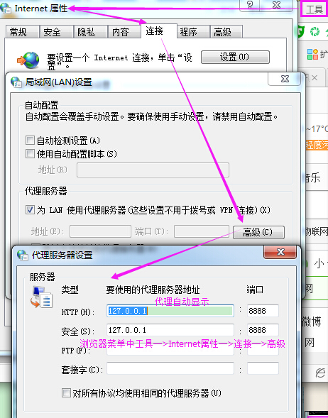 代理查看方式:浏览器菜单栏上:工具—>Internet选项—>连接—>局域网设置—>高级代理。
