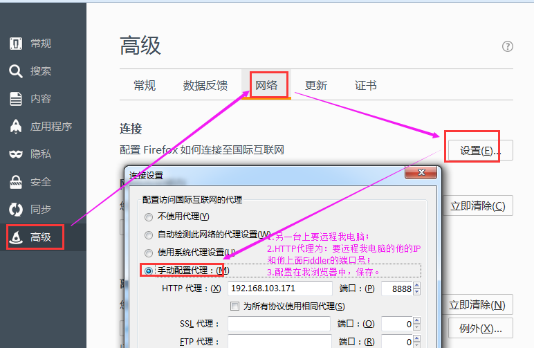 ——>选项——>高级——>网络——>连接——>设置——>手动配置代理——>Http代理和端口输入(与Fiddler代理端口保持一致);