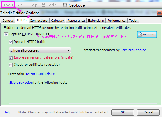 Tools——>Telerik Fiddler Options——>HTTPS下,勾选:CaptureHTTPS CONNECTs、Decrypt HTTPS traffic 、ignore server certificate errors(unsafe)——>点击OK,弹出证书之后直接确认就行。