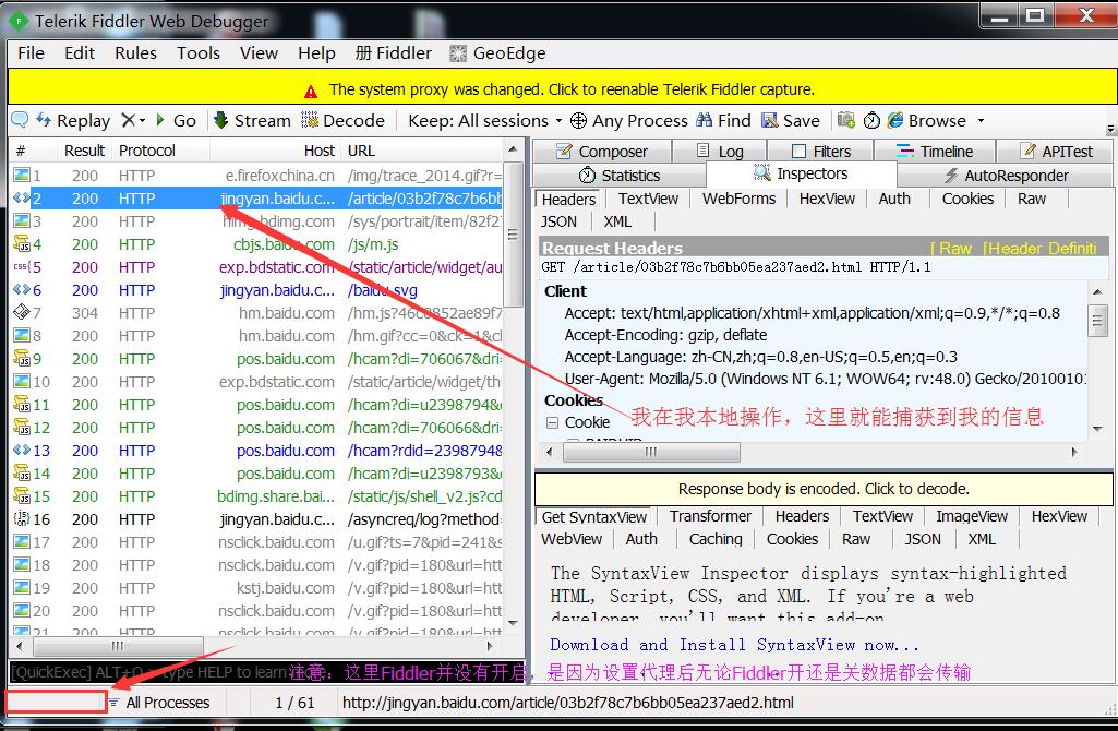 指定代理之后,无论Fiddler开关是关闭还是打开,数据都会传输过来,见上图。