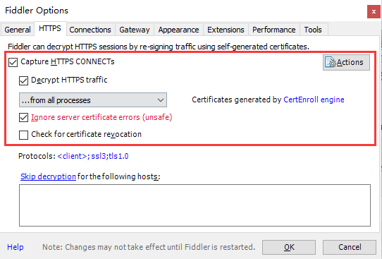 如果需要监听不可信的证书的HTTPS请求的话,需要勾选“Ignore servercertificate errors”。