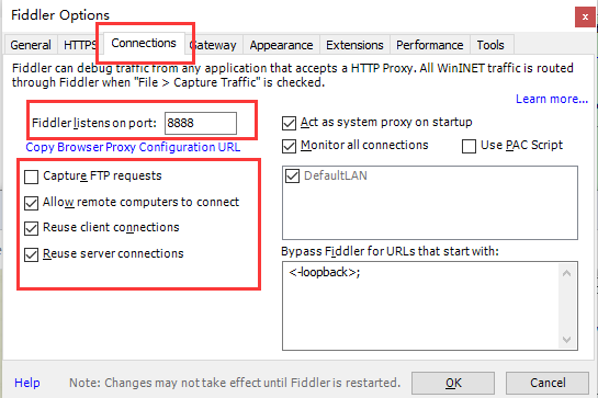 (1)打开Conections配置项,勾选allow remote computers to connect,默认监听端口为8888(下图Fiddler listens on port就是端口号),若端口被占用可以设置成其他的,配置好后要重新启动fiddler,如下图: