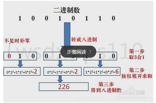 方法为:3位二进制数按权展开相加得到1位八进制数。(注意事项,3位二进制转成八进制是从右到左开始转换,不足时补0)。