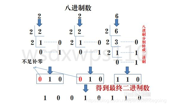 方法为:八进制数通过除2取余法,得到二进制数,对每个八进制为3个二进制,不足时在最左边补零。