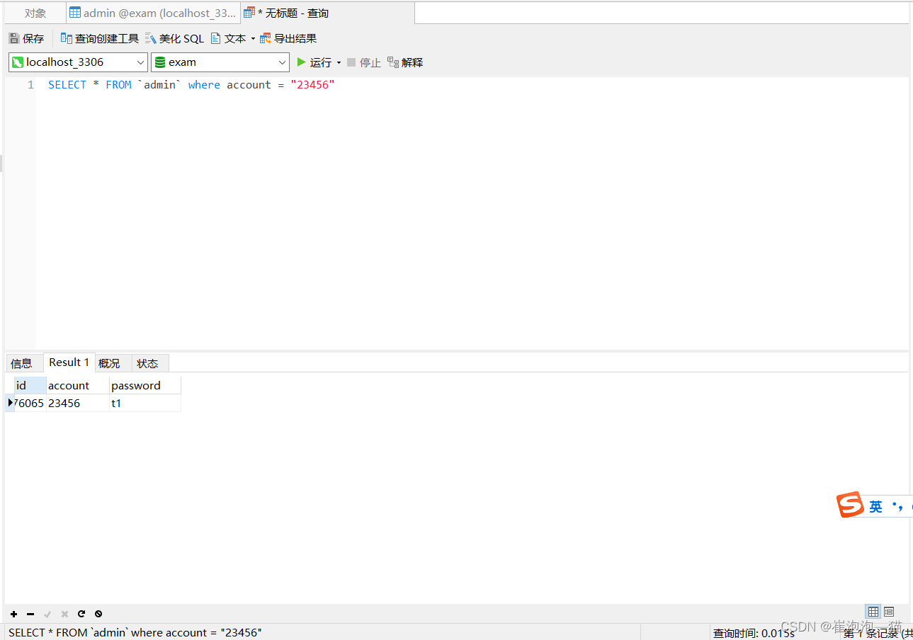 要求:在admin表中有45万条数据,现在要查询account等于"10000"的那条数据