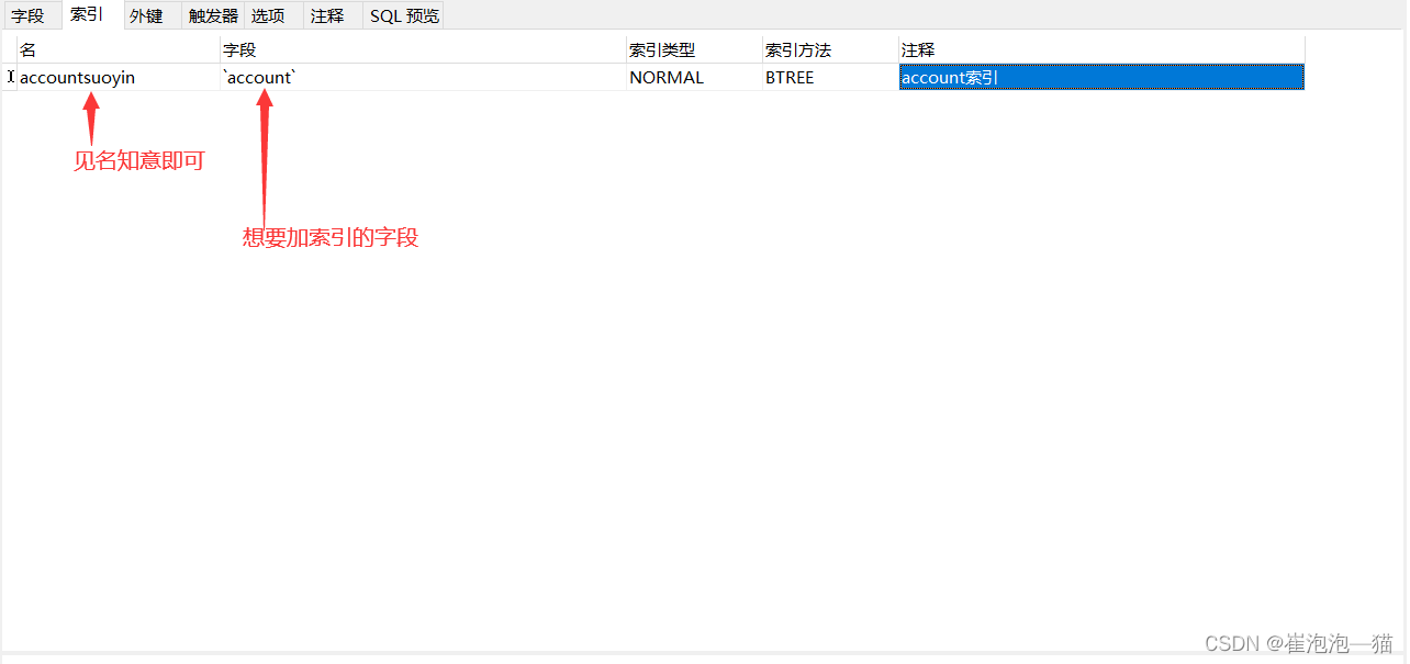 进入表设计页面,点击索引,设计account成索引,索引方法设置成树