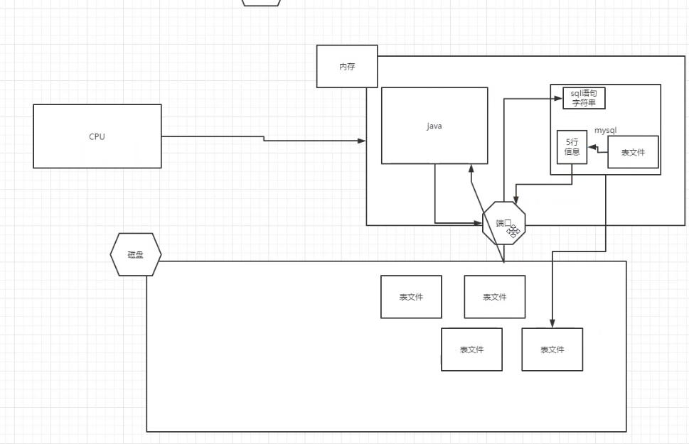 mysql进程一直监听着3306端口,当接收到http请求时解析出SQL语句,通过SQL语句的执行消耗一部分内存把存储在磁盘中想要操作的表文件(一个表就是一个文件)加载到mysql中