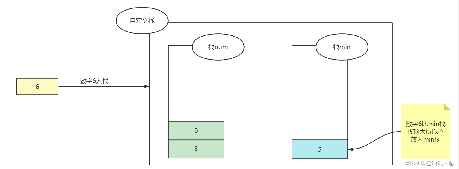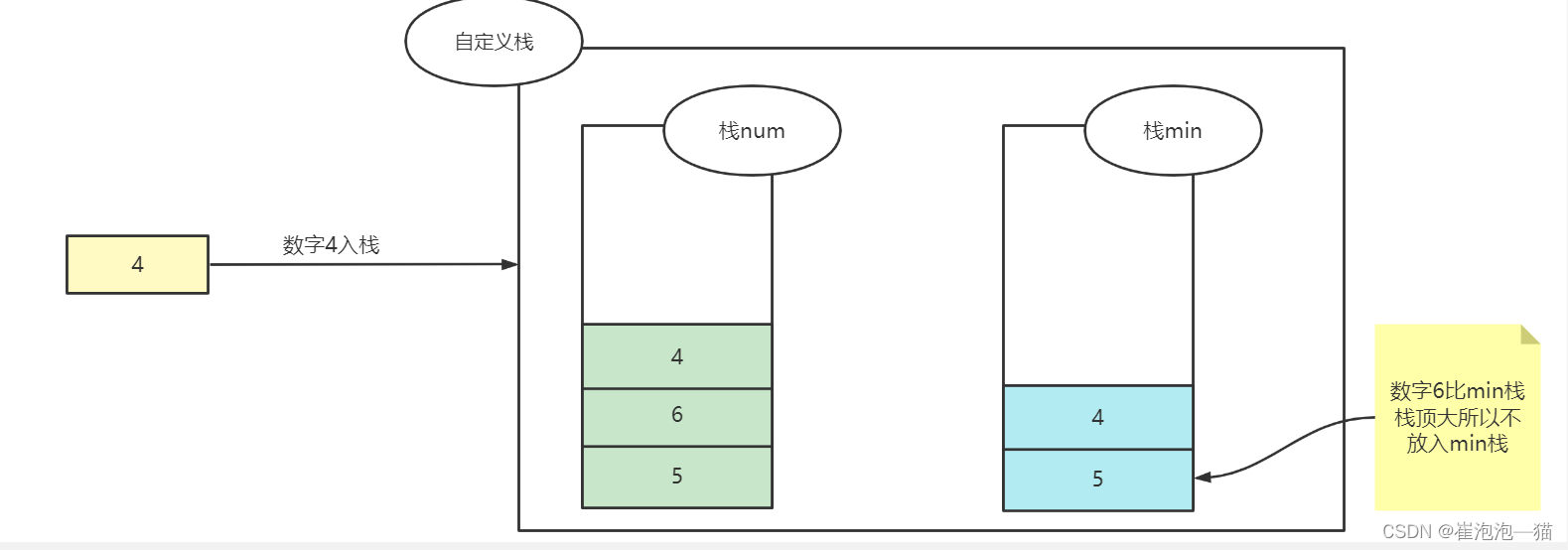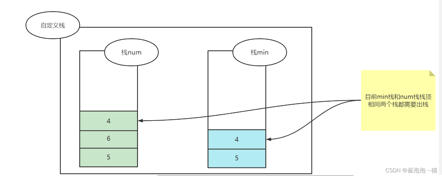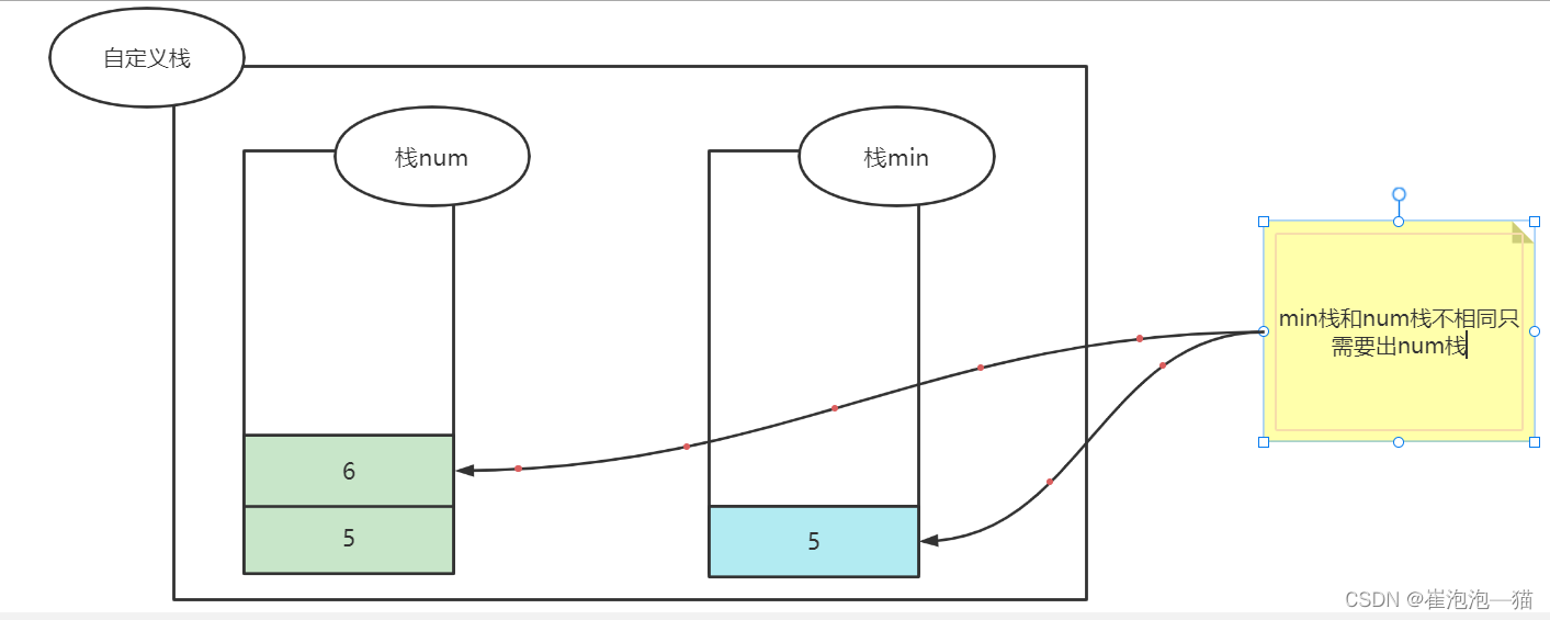 思路:定义两个栈num和min,num栈用来实现入栈出栈,min栈的栈顶一直是num栈中所有数的最小值,当有数据入栈时先向num栈存储该数,接着判断min栈是否为空,如果为空的话就直接存入,如果不为空的话将入栈的数与min栈栈顶元素比较,如果入栈的数更小那么min栈入栈,出栈时判断min栈栈顶与num栈栈顶是否相等,相等的话min出栈,然后让num出栈,不相等的话min不出栈,返回最小值时直接返回min栈的栈顶即可