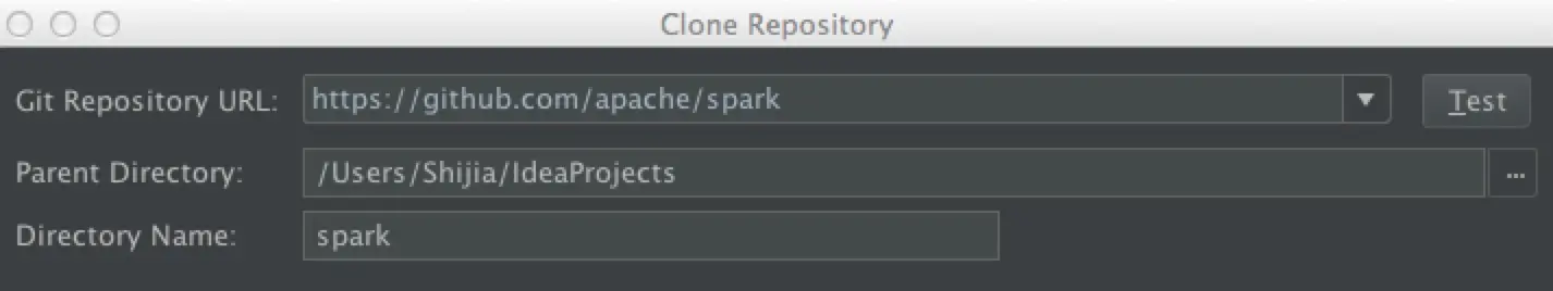 打开IntelliJ IDEA 后,在菜单栏中选择 VCS→Check out from Version Control→Git,之后在 Git Repository URL 中填入 Spark 项目的地址,并指定好本地路径,如下图所示。