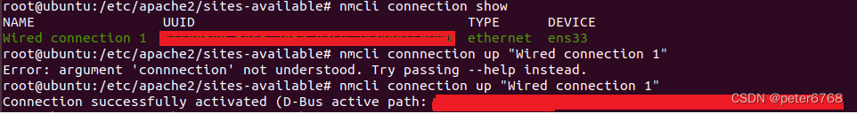 查看默认链接名 nmcli connection show,然后nmcli connection up 'Wired connection 1'刷新网卡
