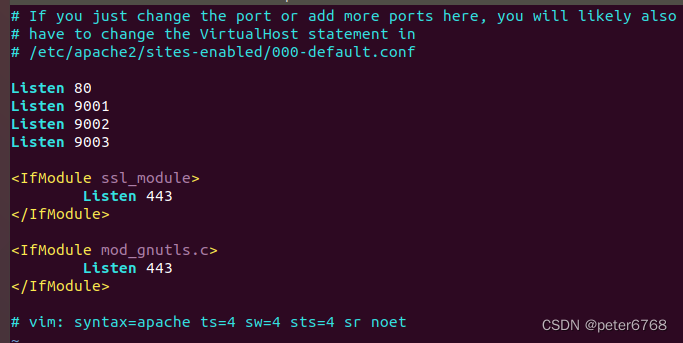 修改配置文件/etc/apache2/ports.conf,默认已经监听了80端口,添加9001,9002,9003端口监听,如下图