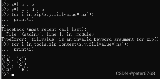 itertools.zip_longest zip压缩的多个迭代器长度不相同时,迭代次数为最长的那个迭代器,缺失值可提供参数fillvalue='xxx'实现