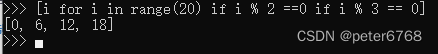 一层for内可连接多个if,if的关系为and:[i for i in range(20) if i % 2 ==0 if i % 3 == 0]