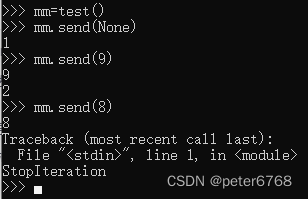 作用 生成器的send方法可实现对生成器双通道操作,即yield是生成器向外部传东西,而send是从外部向生成器内部传东西。使用yield很简单,对生成器迭代赋值即可,在生成器内部使用外部send进来的变量句法类似于a = yield b,最后a的值是外部send的传参而不是b,b是yield到外部的值