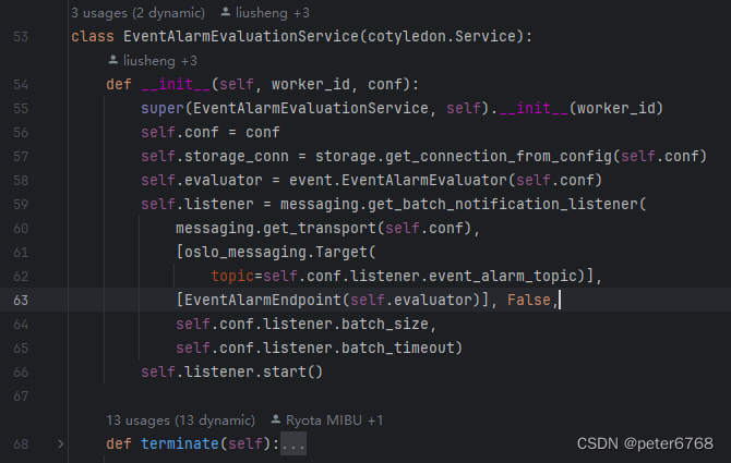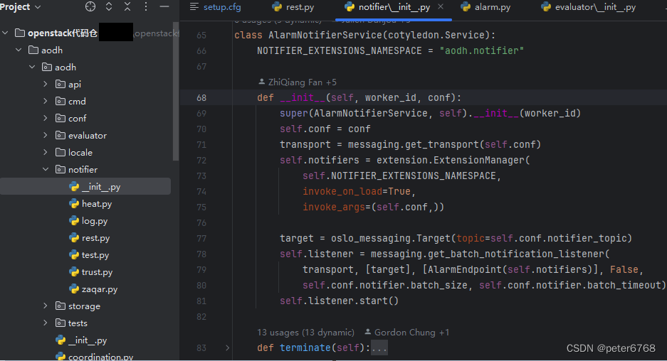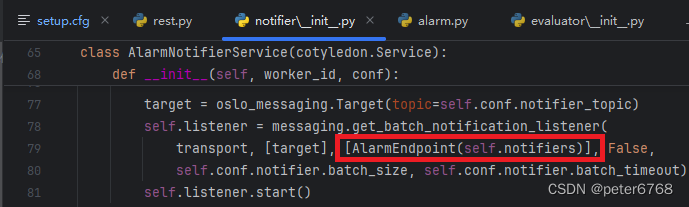 监听发送告警所在队列逻辑在类初始化里完成,监听队列名从conf.notifier_topic获取,默认为alarming