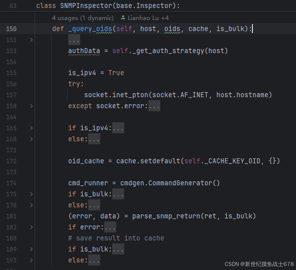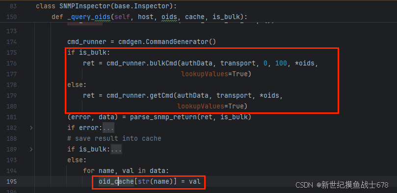 通过udp调cmdgen.CommandGenerator查询oid对应的值,查完放到cache里,该函数没有返回值。如果oid查询结果只有一个值,调用getcmd,如果oid查询结果有多个值,调用bulkcmd