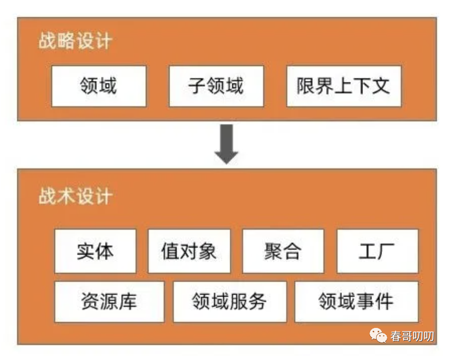 在战术设计层面提出了实体、值对象、领域服务、领域事件、聚合、工厂、资源库等重要概念。