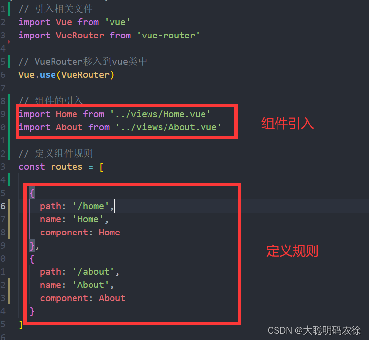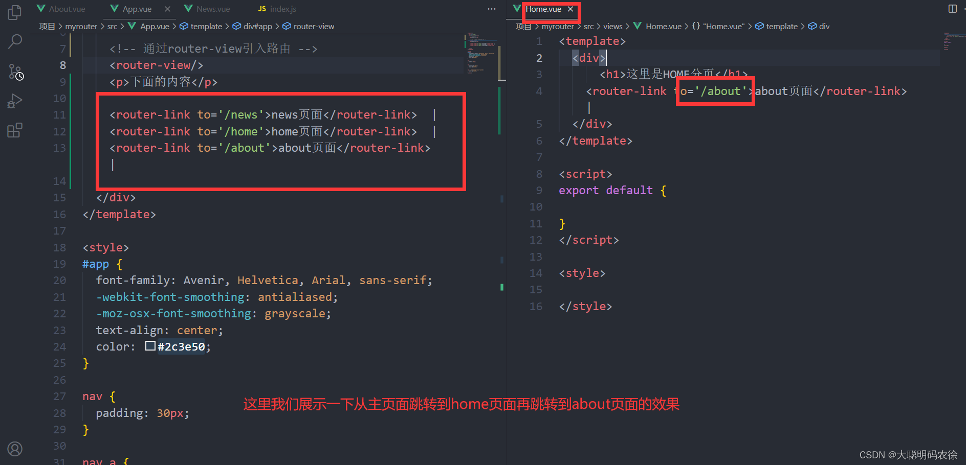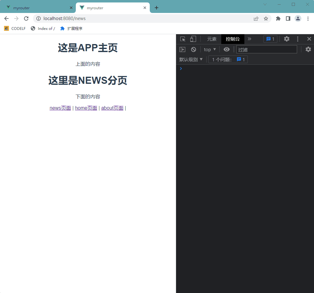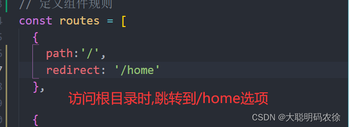 实现: 通过路由规则的redirect属性,指定一个新的路由地址,可以很方便地设置路由的重定向