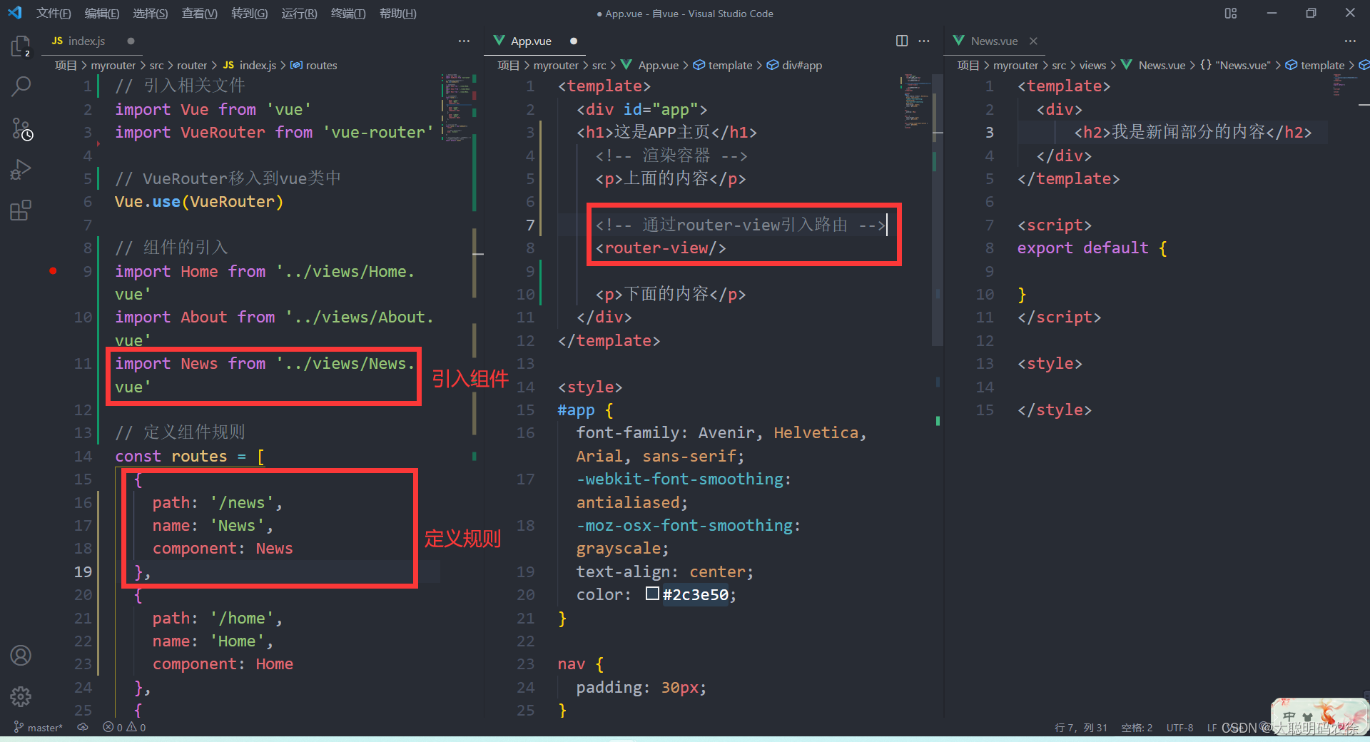 核心思想:在父路由组件的模板内容中添加子路由链接和子路由填充位(占坑),同时在路由规则处为父路由配置children属性指定子路由规则