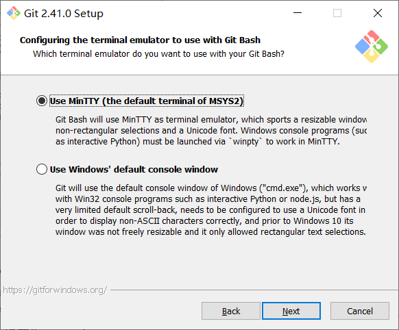第一个选项是“使用MinTTY(MSYS2的默认终端)”。Git Bash将使用MinTTY作为终端模拟器,该模拟器具有可调整大小的窗口,非矩形选择和Unicode字体。Windows控制台程序(例如交互式Python)必须通过“ winpty”启动才能在MinTTY中运行。