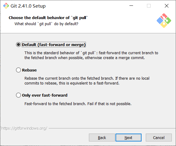 第二个选项是“使用Windows的默认控制台窗口”。Git将使用Windows的默认控制台窗口(“cmd.exe”),该窗口可以与Win32控制台程序(如交互式Python或node.js)一起使用,但默认的回滚非常有限,需要配置为使用unicode 字体以正确显示非ASCII字符,并且在Windows 10之前,其窗口不能自由调整大小,并且只允许矩形文本选择。
