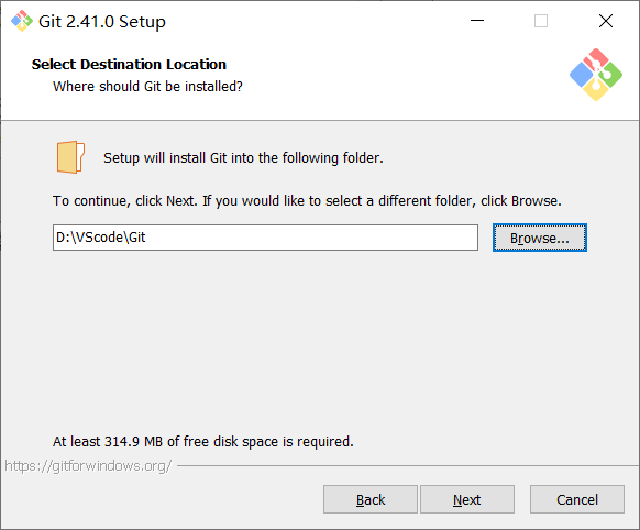 在输入框内输入想要安装到的本机路径,也就是实际文件夹位置,我是想用VScode和Git相结合使用的,所以我把它俩儿放一起。