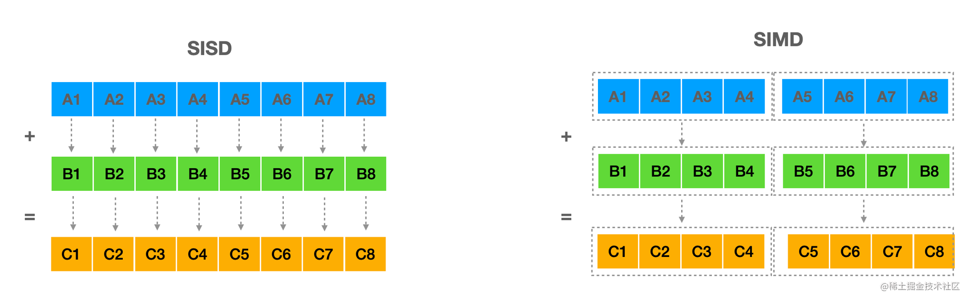 如图所示,从宏观的角度看SISD(单指令单数据流)和SIMD(单指令多数据流),对数组A、B中对应下标位置的数据进行相加,结果存到数组C中。对于SISD,N次循环操作,每次对一对数据进行处理。对于SIMD,一次操作可以同时处理四对数据,只需要 N/4次循环。两者的主要区别是单次指令执行处理的数据容量不同。