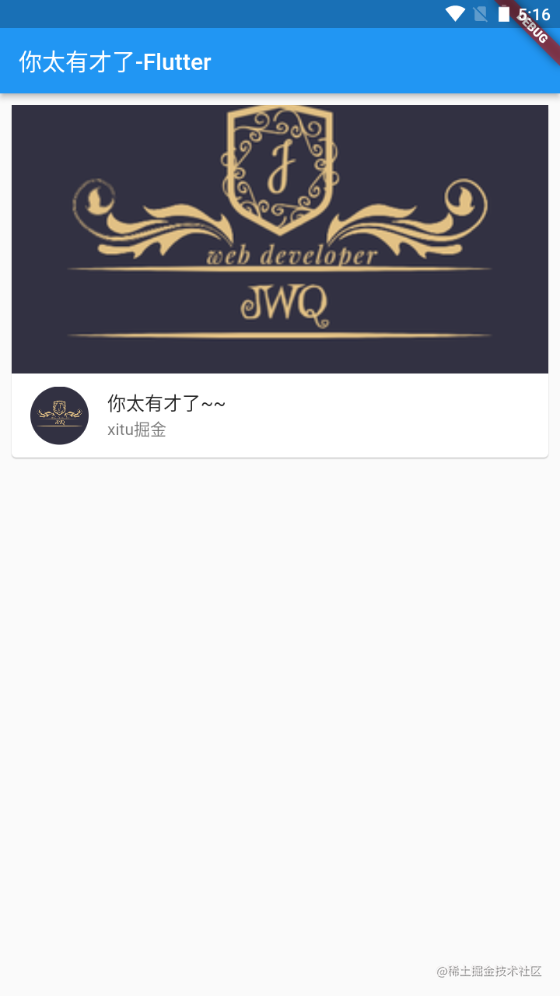 class HomeContent extends StatelessWidget {@overrideWidget build(BuildContext context) {// TODO: implement buildreturn ListView(children: [Card(margin: EdgeInsets.all(10.0),child: Column(children: [AspectRatio(aspectRatio: 2 / 1,child: Image.network('https://p9-passport.byteacctimg.com/img/user-avatar/c21cdb224f42c072c2bb55075c9adf8d~300x300.image',fit: BoxFit.cover,),),ListTile(title: Text('你太有才了~~'),subtitle: Text('xitu掘金'),leading: Container(width: 50,height: 50,decoration: BoxDecoration(borderRadius: BorderRadius.circular(25),image: DecorationImage(image: NetworkImage('https://p9-passport.byteacctimg.com/img/user-avatar/c21cdb224f42c072c2bb55075c9adf8d~300x300.image'))),),)],),)],);}