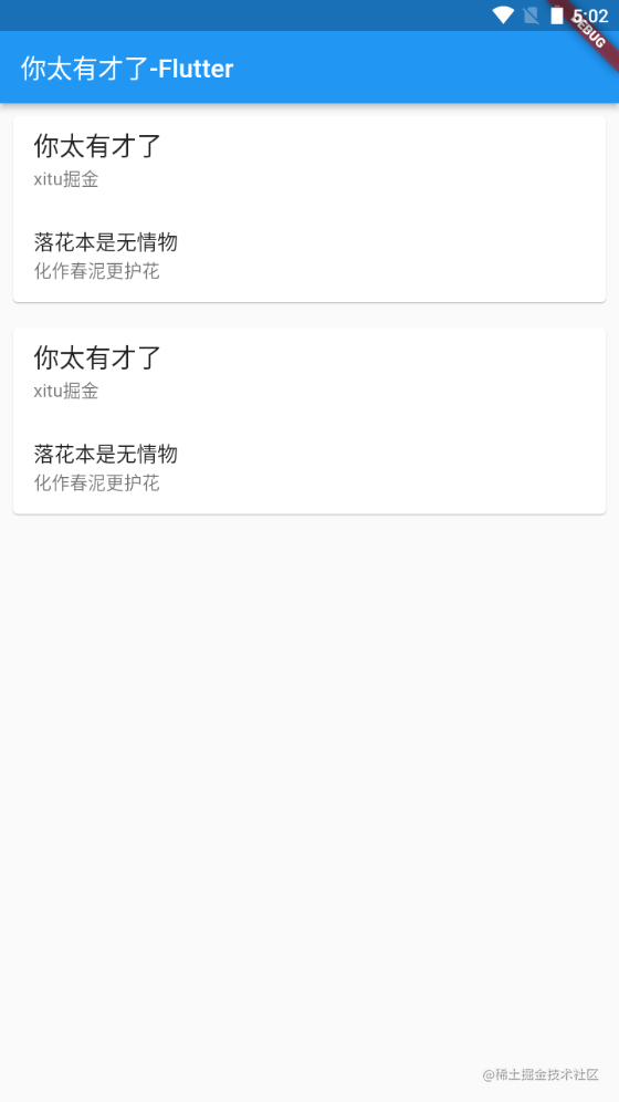 class HomeContent extends StatelessWidget {@overrideWidget build(BuildContext context) {// TODO: implement buildreturn ListView(children: [Card(margin: EdgeInsets.all(10),child: Column(children: [ListTile(title: Text('你太有才了',style: TextStyle(fontSize: 20.0),),subtitle: Text('xitu掘金'),),ListTile(title: Text('落花本是无情物'),subtitle: Text('化作春泥更护花'),)],),),Card(margin: EdgeInsets.all(10),child: Column(children: [ListTile(title: Text('你太有才了',style: TextStyle(fontSize: 20.0),),subtitle: Text('xitu掘金'),),ListTile(title: Text('落花本是无情物'),subtitle: Text('化作春泥更护花'),)],),)],);}