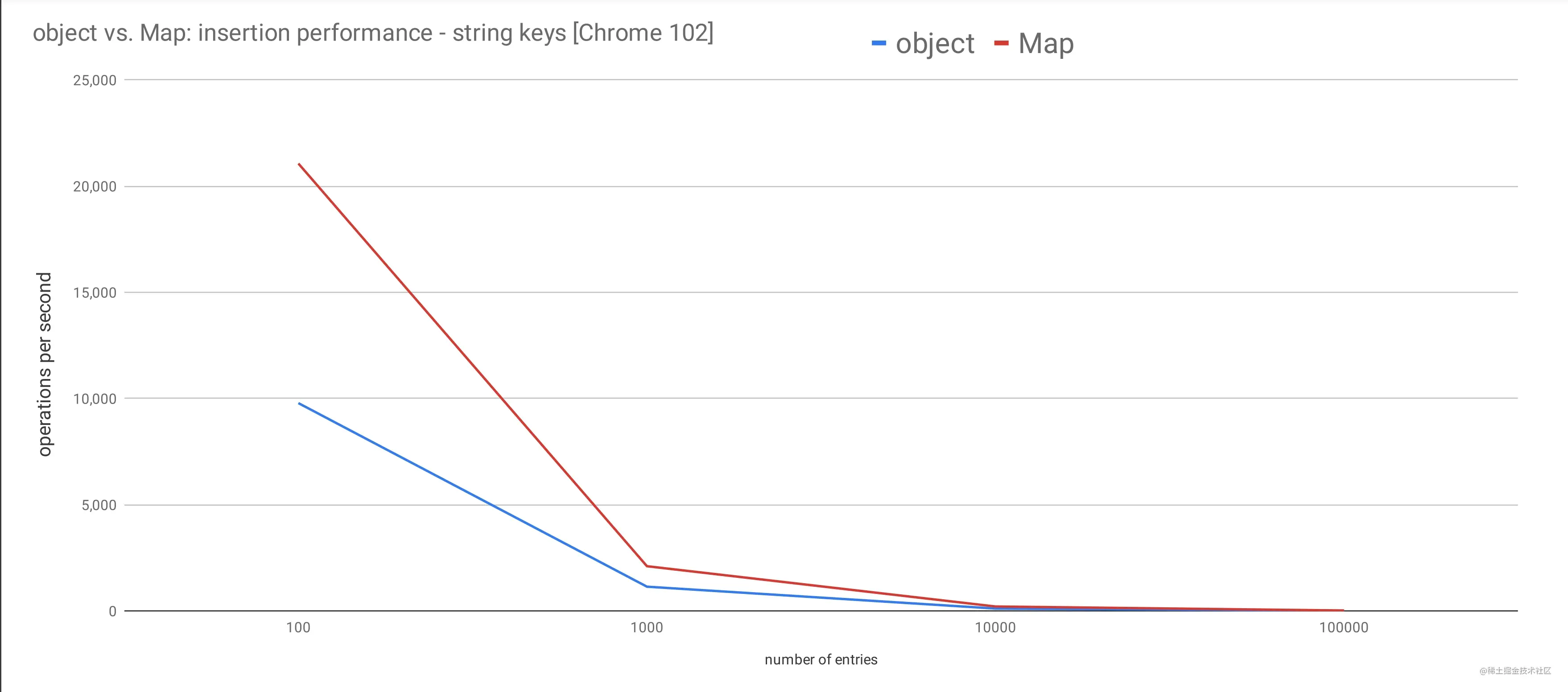 但是当条目数并没有特别大的时候(100000 以下的时候),在插入操作的速度上 Map 基本是 Object 的两倍,但当大小超过 100000 时,性能差距会开始缩小。