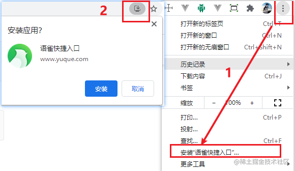 按照上述的步骤配置好,在浏览器运行后,即可点击浏览器地址栏的安装按钮来触发安装弹窗。也可以通过点击Button来主动触发安装弹窗。