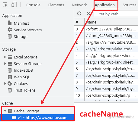 self: 这是 Service Worker 中特有的全局对象,类似与主线程中的window对象。*event.waitUntil: 该函数接受一个Promise对象,它告诉 Service Worker,内部的Promise对象没有resolve之前,缓存工作就还没有完成,安装阶段也就没有完成,并且不应该转移到下一个阶段。*caches: CacheStroge对象,它用来控制缓存相关的工作,caches对象的很多方法都是异步的,会返回一个Promise对象,更多详细的API可以参考这里(参考资料 6)。* 缓存会保存在cacheName选项下: