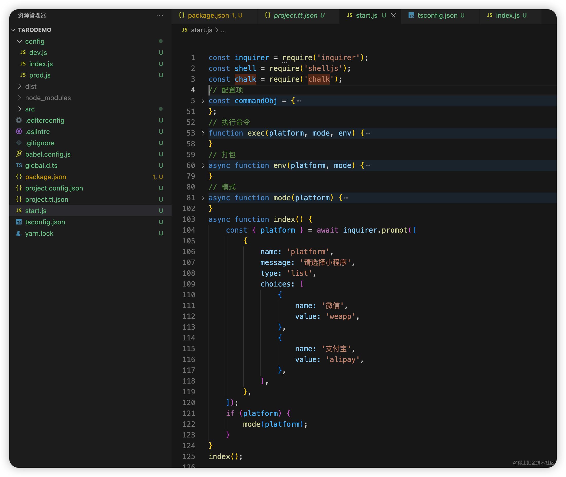 这不是我当时初学框架时候用脚手架搭建项目的时候选择配置的交互效果吗!本着学会了就是自己的的原则,立马打开package.json看看这个start命令到底干了什么!