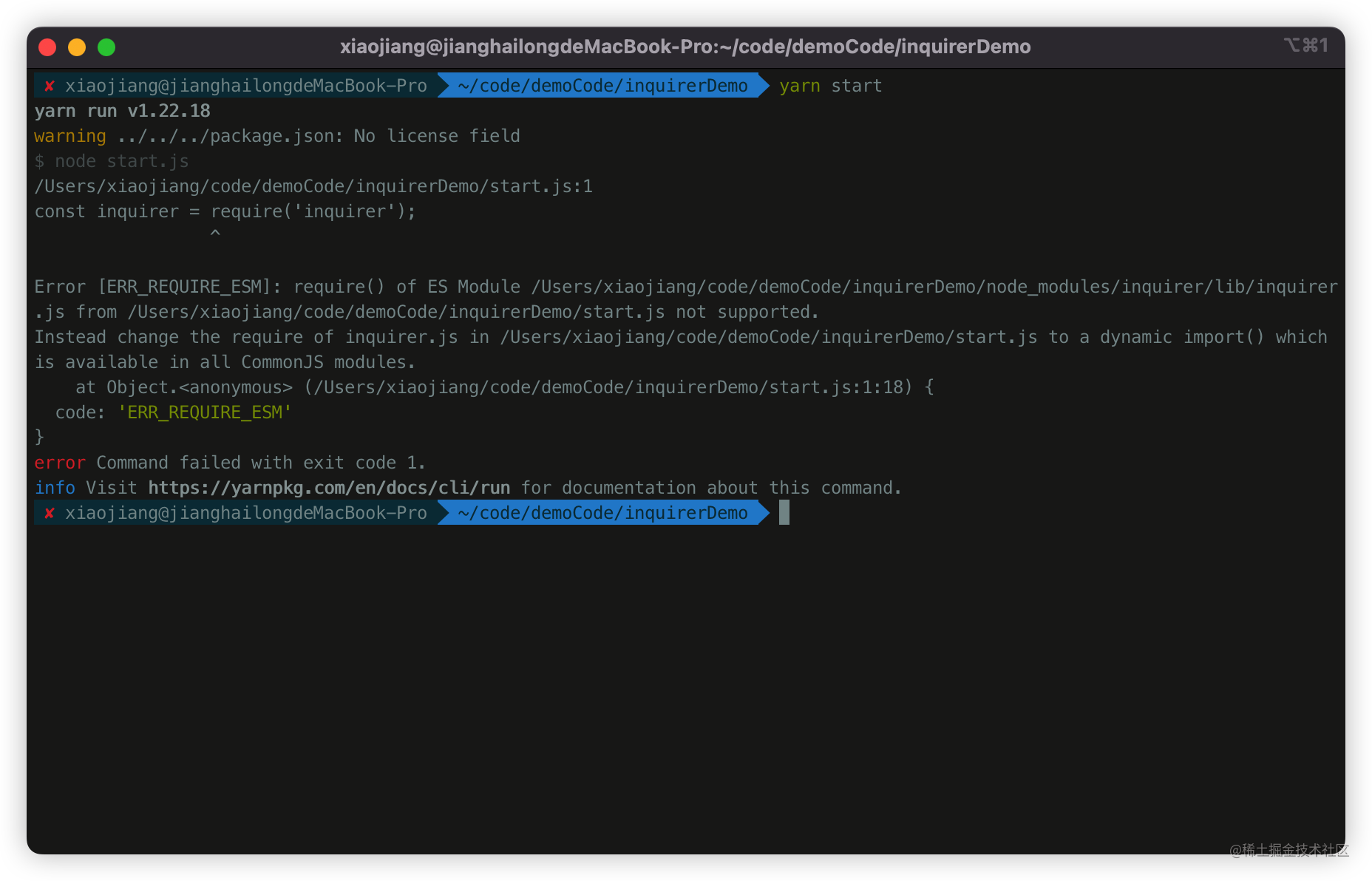 查了一下资料,发现最新版本的chalk、inquirer 不支持CommonJS语法