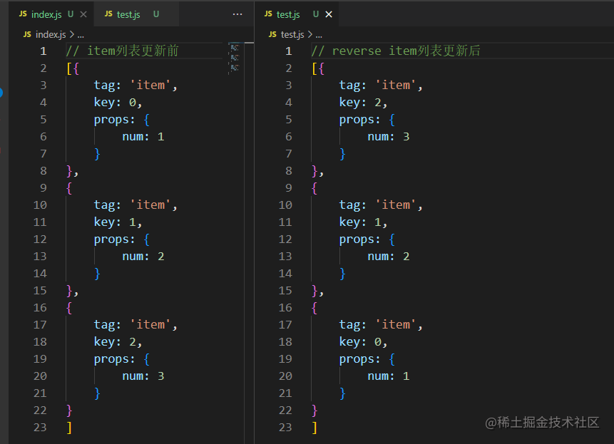 表面上,demo1只是调换了item1和item3的位置,点击后也是就改变了item1和item3;而demo2三个都改变了。这时有人就会觉得使用index作为key改动DOM结构还更小,岂不是更好?