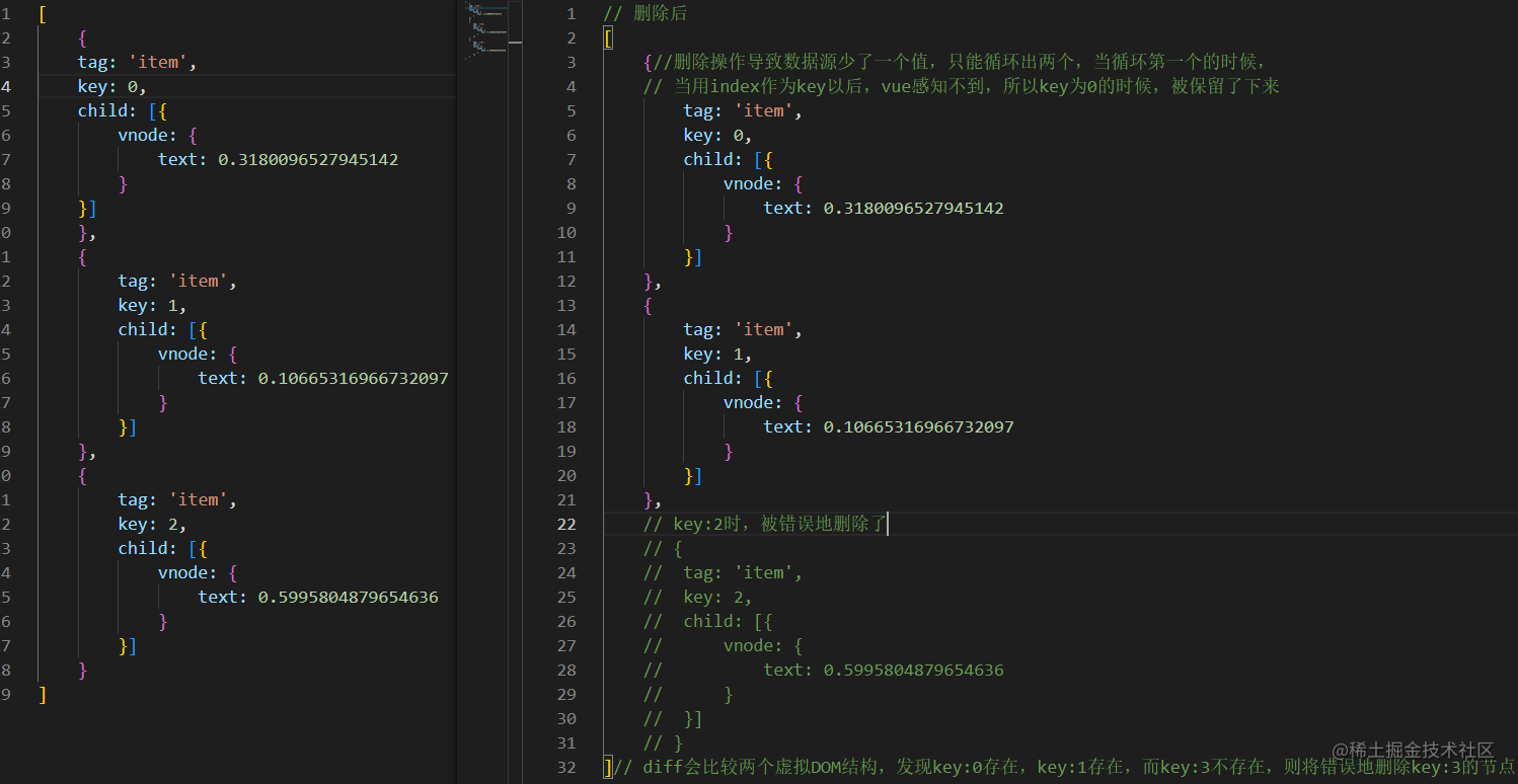 使用index作为key时,在删除数据时,因为vue不会深入地区对比子组件的文本内容,所以会错误移除VDOM中的节点(index的值是不固定的)。