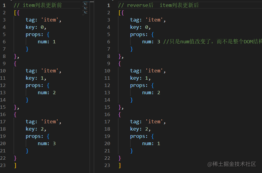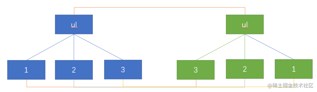 当点击按钮change以后,list反转变为:list:[3,2,1],diff算法会根据DOM树,从上到下,从左到右判断值是否更新。问题是,为什么diff就知道谁跟谁去进行比对呢?这就是key的作用了,key是唯一标识符,diff算法会根据key去比对。