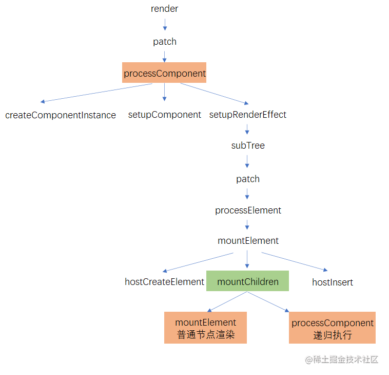 在mountElement的过程中,如果遇到mountChildren渲染过程子组件列表,普通节点会通过mountElement进行普通节点的创建和插入,组件节点会递归的执行processComponent将子组件树subTree的el插入到父节点中。这样,普通节点的el,子组件树中的el,都插入到了父节点中。依次类推,通过先子后父的方式,一层层的将节点插入到根节点中。