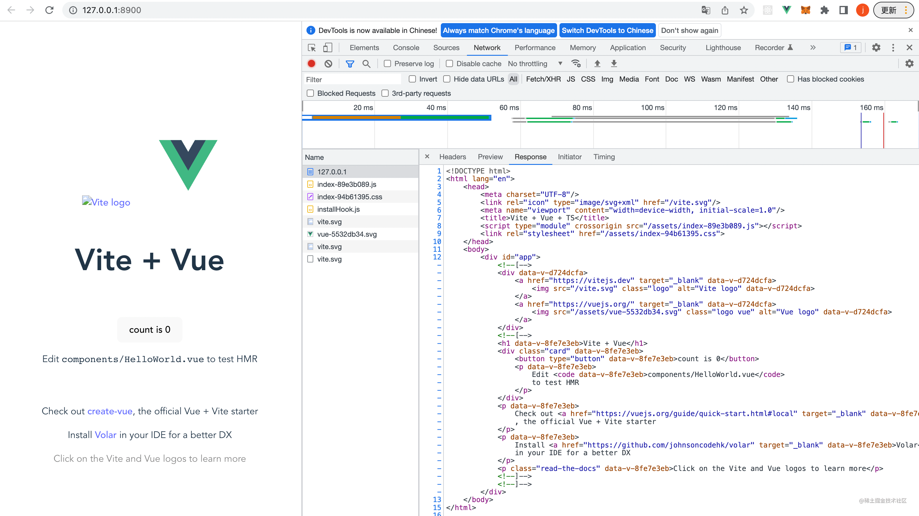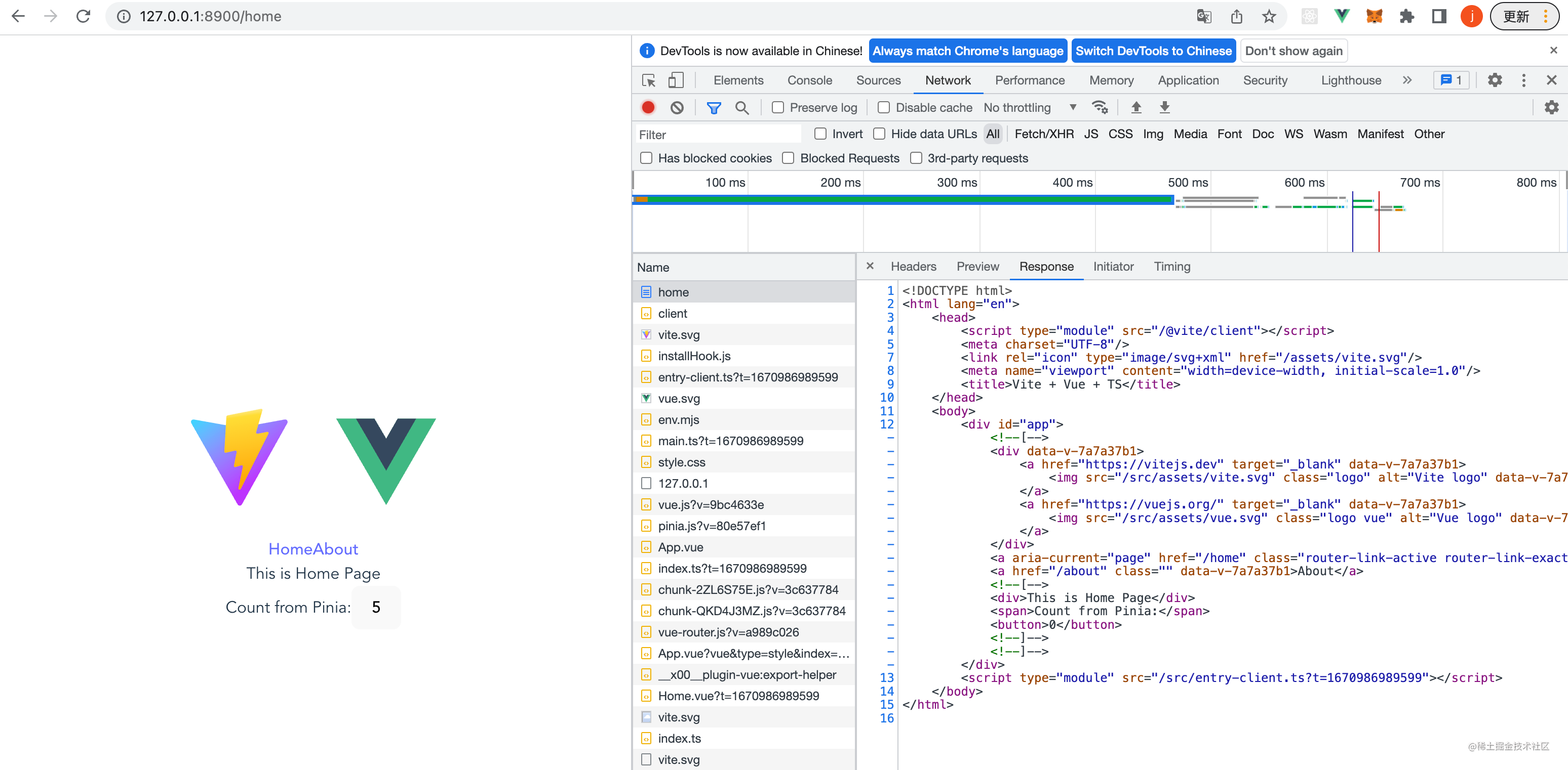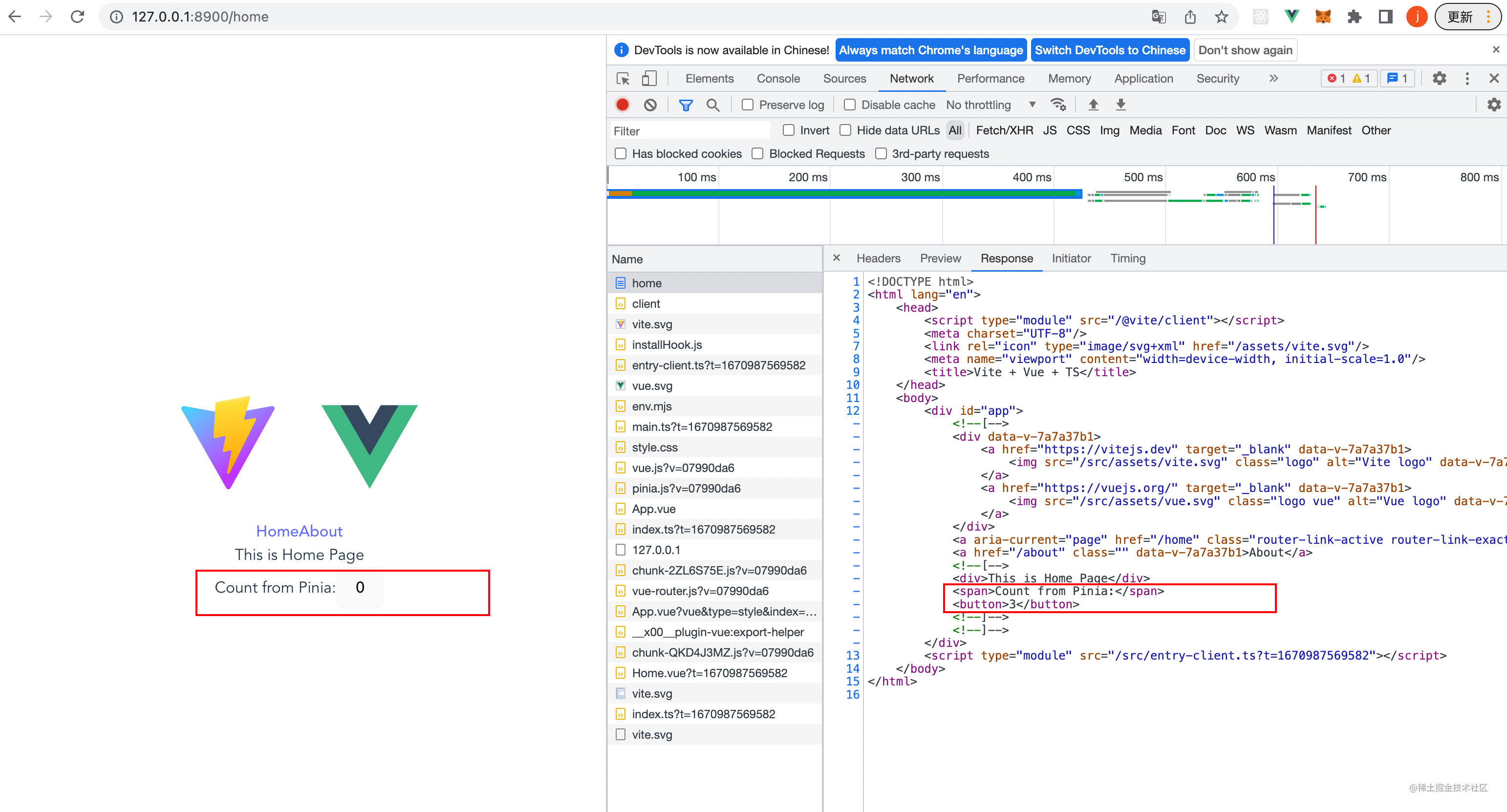 然后我们执行pnpm dev可以正确启动服务,然后访问http://127.0.0.1:8900可以拿到我们的html文件。