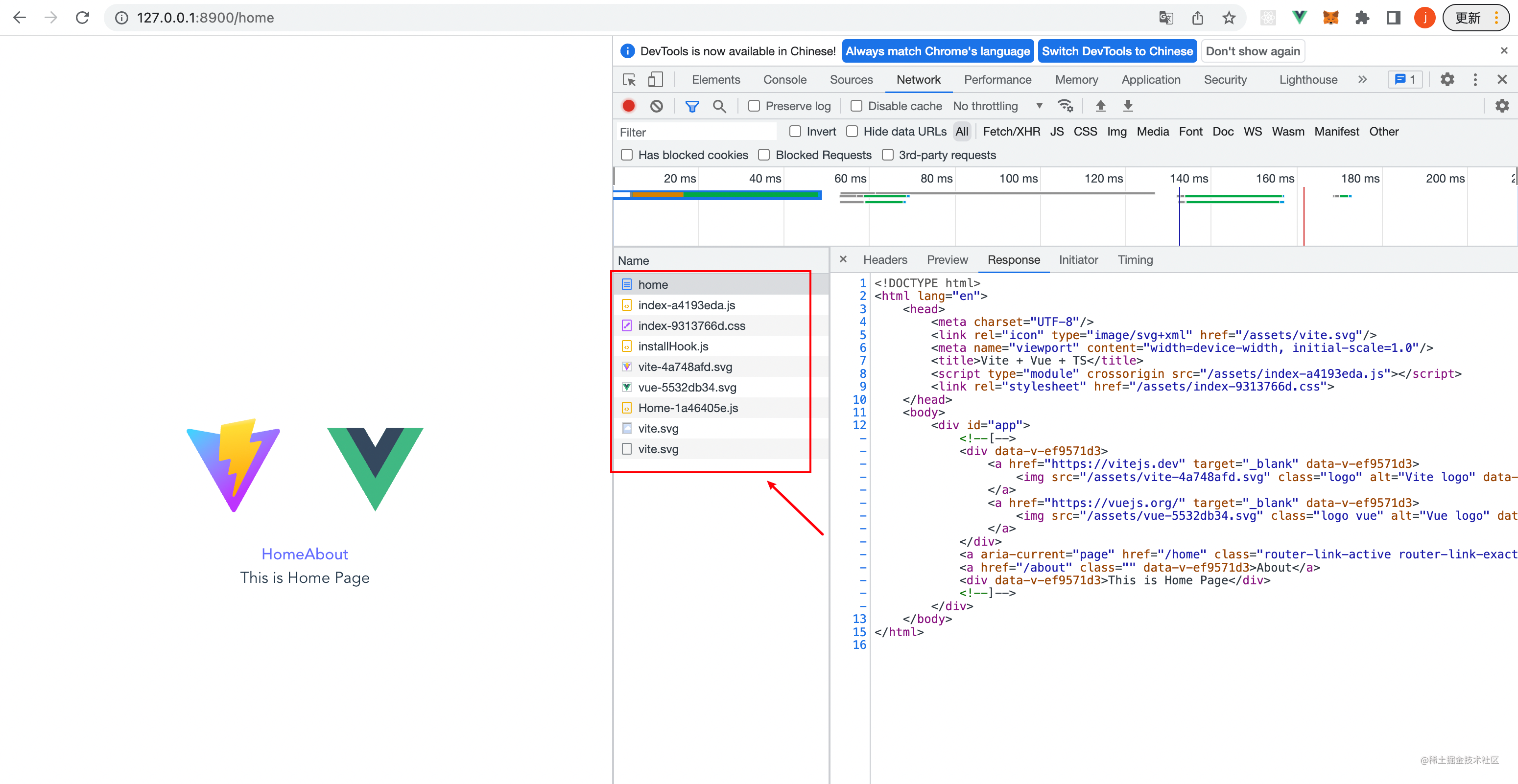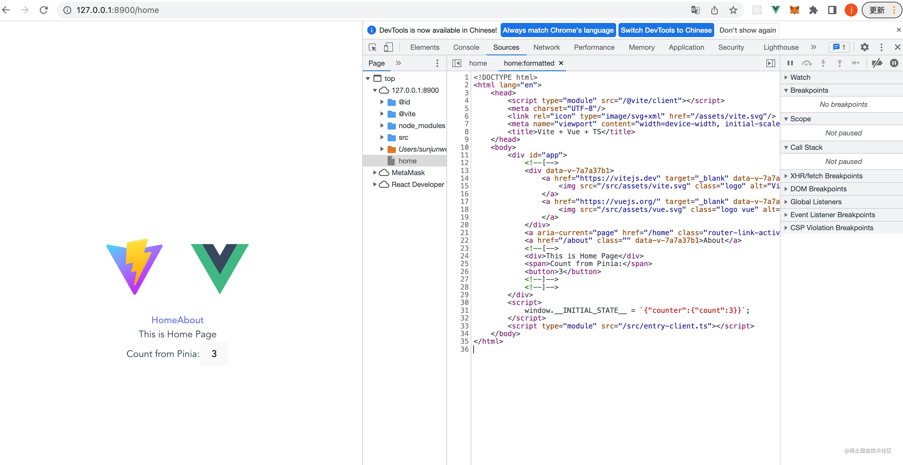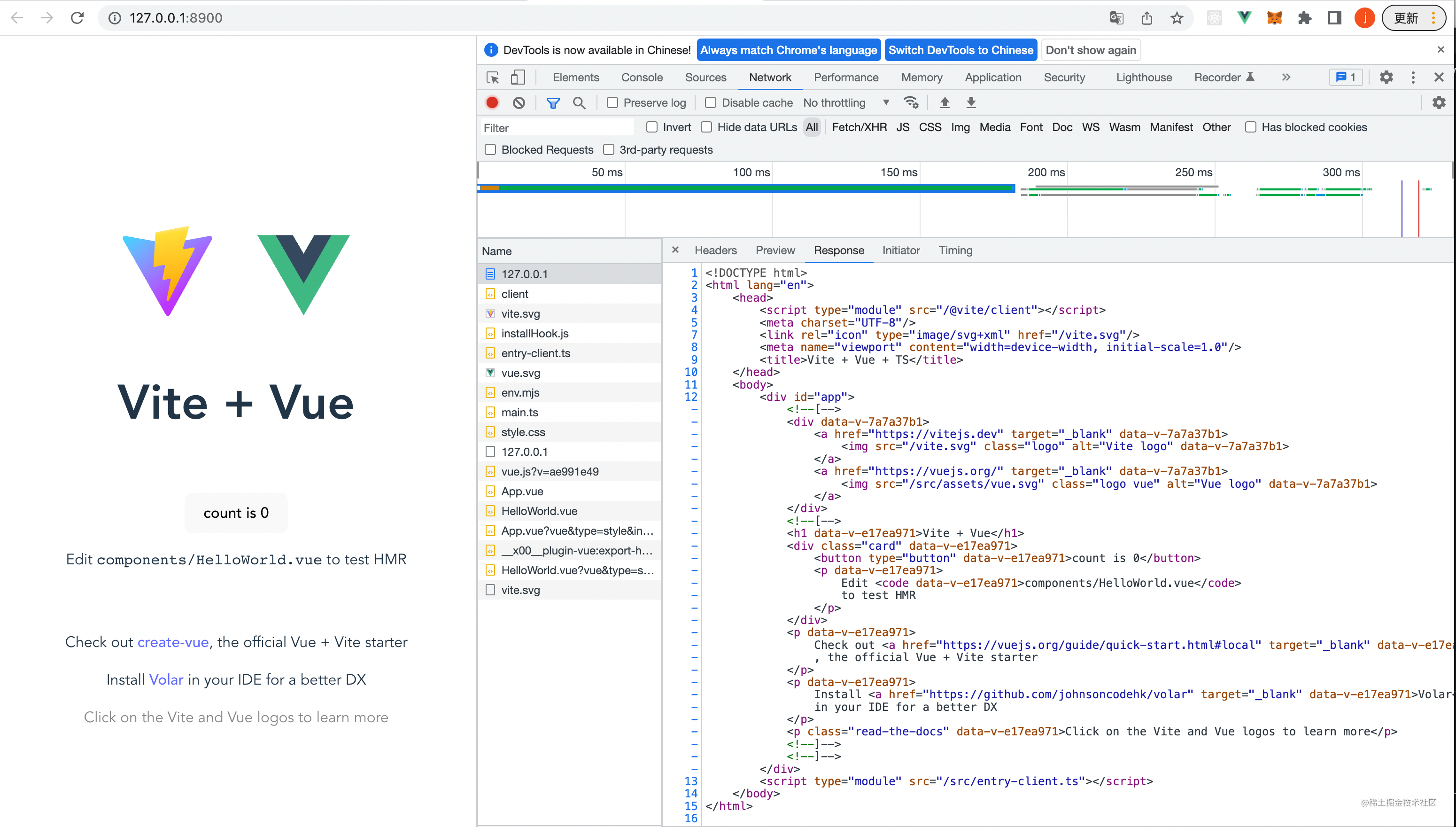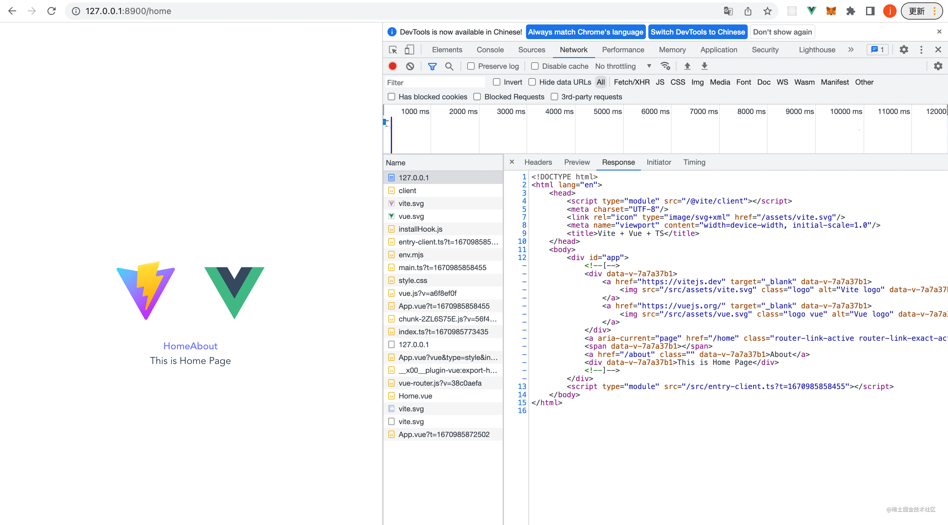 然后我们执行pnpm dev可以正确启动服务,然后访问http://127.0.0.1:8900可以拿到我们的html文件。