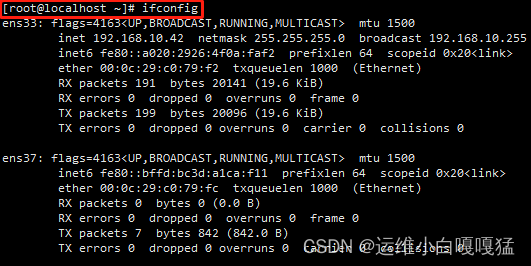 添加完成网卡,使用ifconfig去查看配置,可以看出来ens33为网卡一,而ens37为网卡二,网卡二的IP没有。